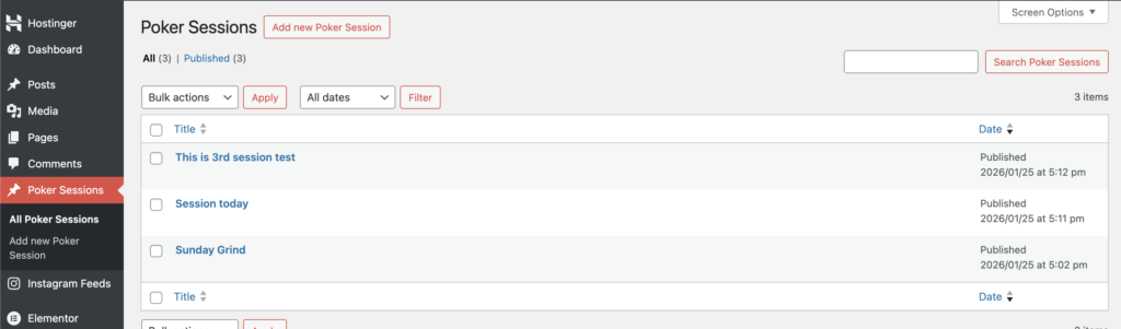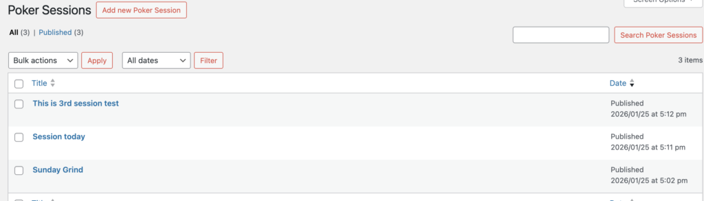 We implemented the tools mentioned above and afterwards started with the first test by using 3 test entries. So we created several columns before in ACF and afterwards in the Environment “Poker Sessions” that we built with CPT UI we have made some test entries (see blow).
